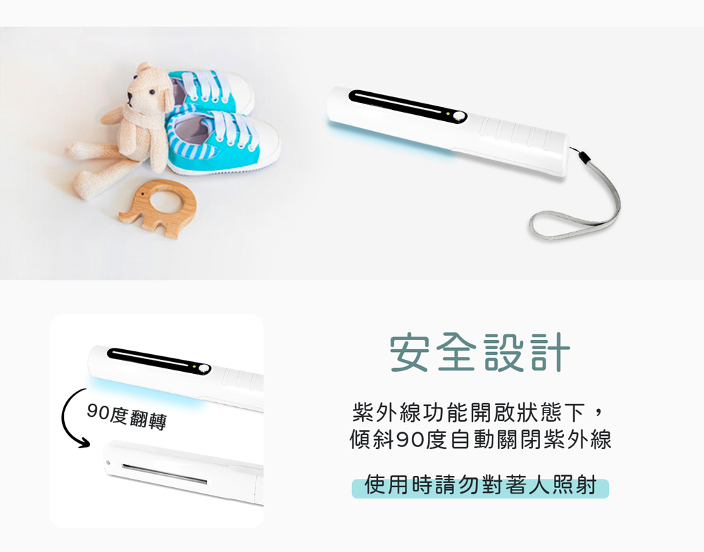 • 安全設計,紫外線燈在消毒過程中旋轉 90 度後自動關閉