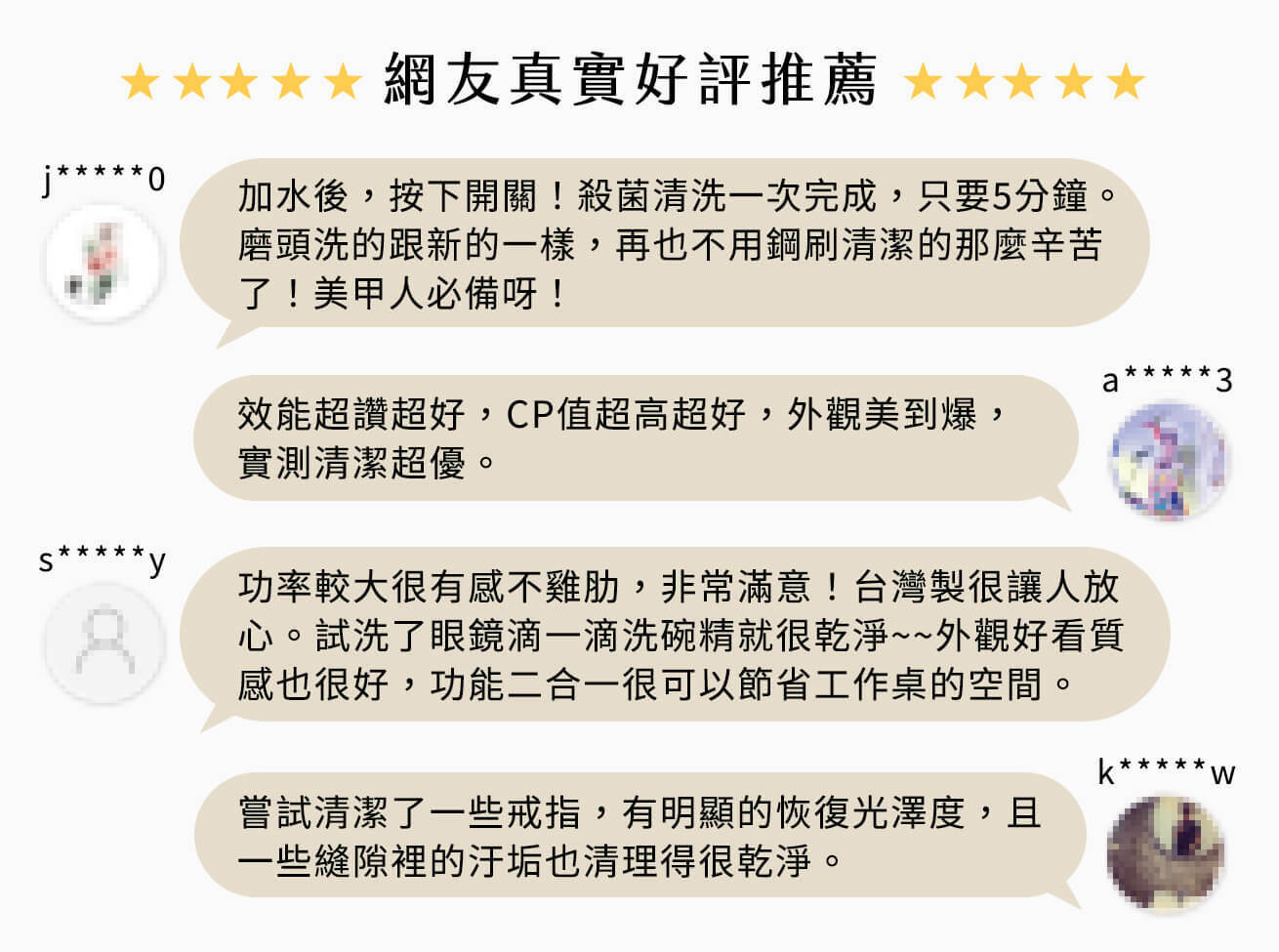 超音波清洗及紫外線消毒功能,均預設為 5 分鐘自動關閉,關閉後可再次按下按鈕清潔
