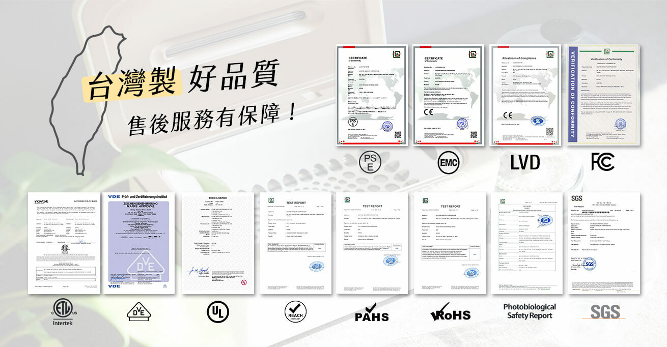 通過 PSE、LVD、EMC、FCC、SGS、ETL、VDE、UL、RoHS、PASH、REACH、生物光危害測試等多項認證,只為了把最好的給你,